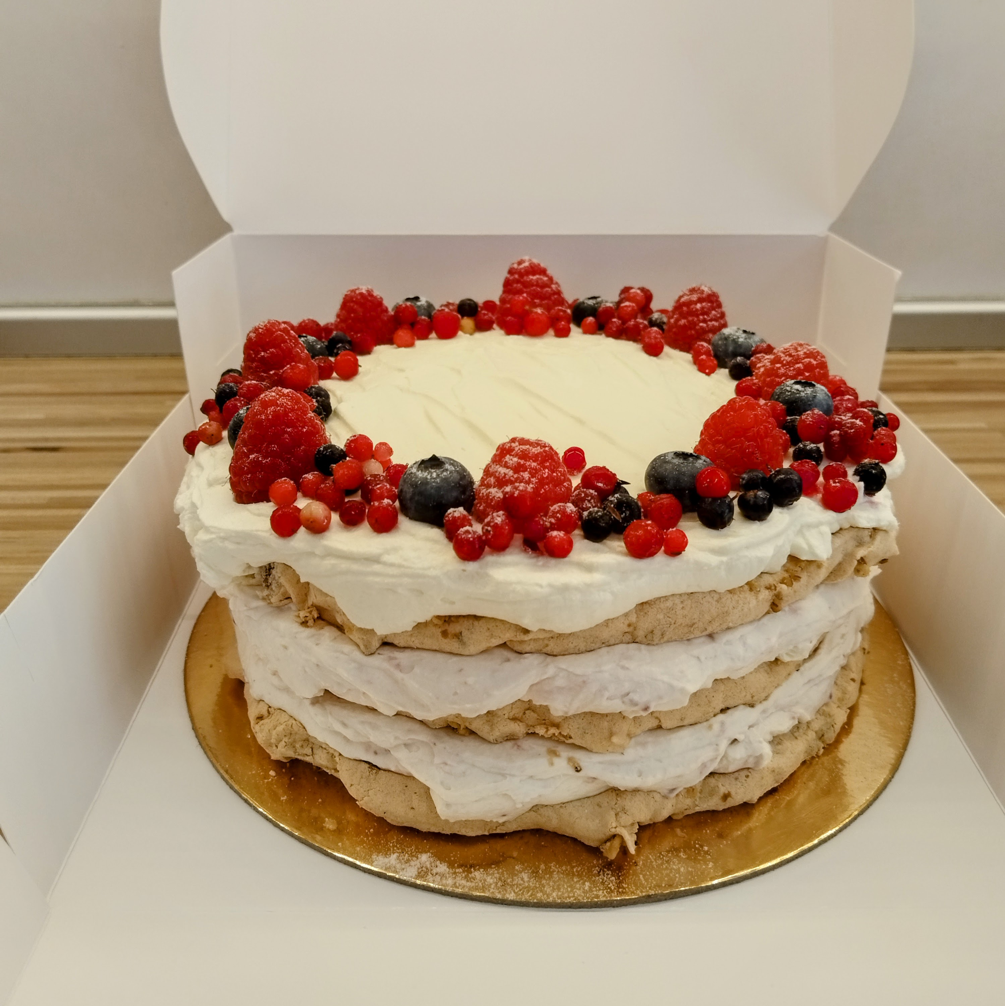 Целувчен блат с орехови ядки, ефирен крем с маскарпоне и сладко от ягоди, посипана с пресни плодове според сезона.